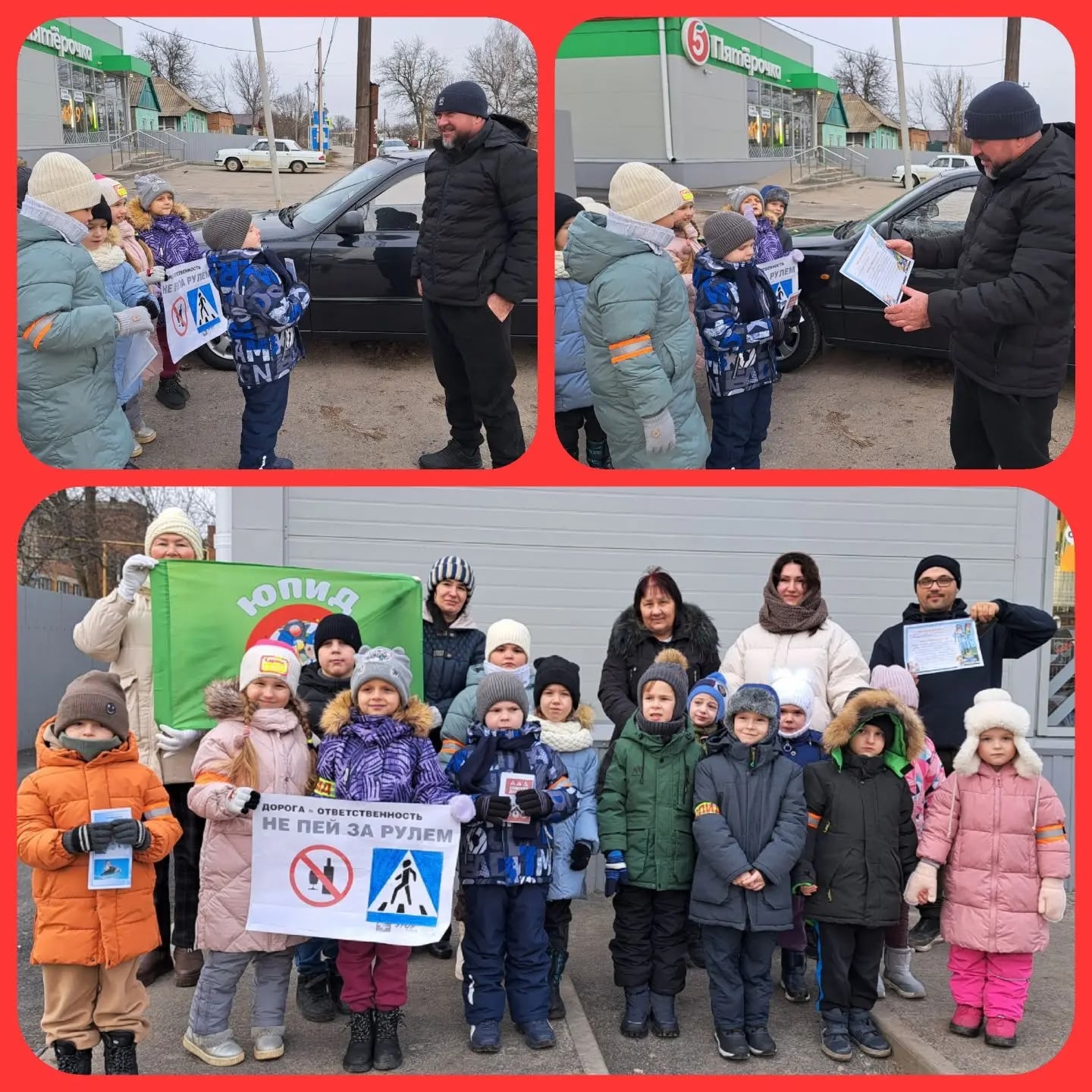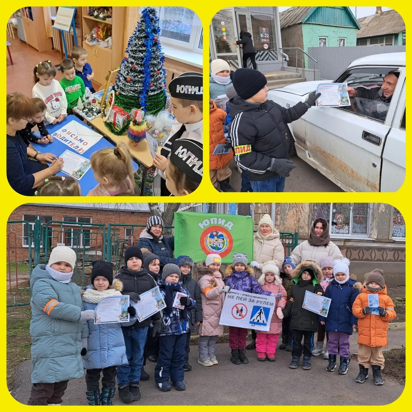 В рамках широкомасштабной акции "Зима. Дороги. Дети. Безопасность." Команда ЮПИД "Зебра" д/с "Алёнушка" с.Фёдоровка провели 2-й этап районной акции "Письмо водителю". Ребята с воспитателем сделали агитационный плакат "Дорога - ответственность. Не пей за рулём!". Написали письма-обращения к водителям, чтоб были внимательными на дороге, соблюдали ПДД и раздали их. Также распространили среди родителей-водителей памятки-листовки "Зимняя дорога!", "Правила перевозки детей в автомобиле!". Соблюдение Правил Дорожного